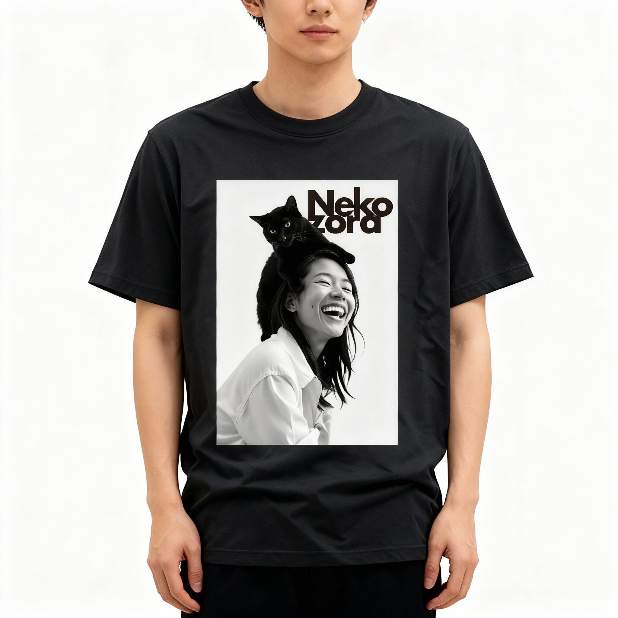 猫×人物のフォトアートを大胆に配置し、シンプルなのに存在感のあるデザイン。